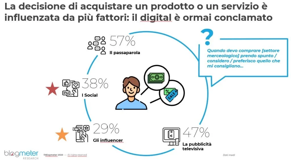 Il mondo del web è ormai fondamentale nella vita degli italiani e questo può influenzare tantissimo le scelte del suo pubblico. Secondo lo studio di BlogMeter, infatti, il 29% del pubblico italiano si lascia “influenzare” nei suoi acquisti dagli Influencer, mentre il 38% decide in base a cosa legge sui Social Network.